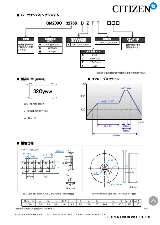 CM200C32768AZFT CITIZEN晶體 32.768kHz ±30ppm 12.5pF 50 kOhm -40°C ~ 85°C
