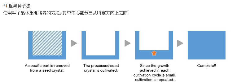 晶體具有更容易或抵抗特定方向生長的特性。在使用框架晶種法的質量改進過程中,放大晶種需要花費大量時間。它涉及反復的培養嘗試,從成功的連接到獲得所需尺寸的晶種需要大約五年的時間。從項目開始到完成靶材大小的晶種晶體的開發,總共花了10多年的時間。