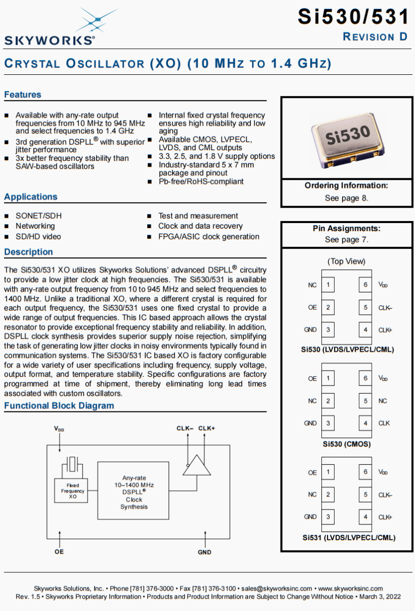 | 530BA125M000DG | Skyworks晶振 | Si530 | XO | 125 MHz | LVDS | 3.3V | ±50ppm |