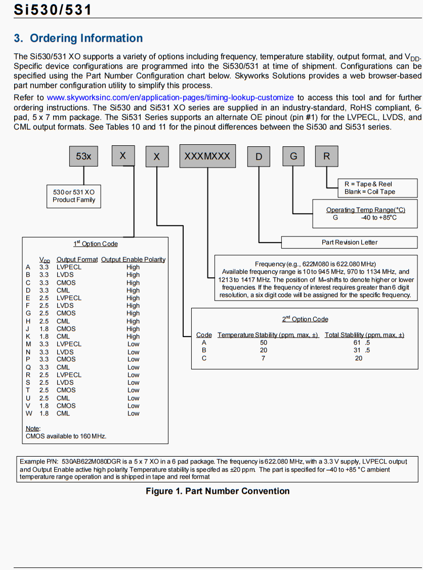 | 530AA156M250DG | Skyworks晶振 | Si530 | XO | 156.25 MHz | LVPECL | 3.3V | ±50ppm |