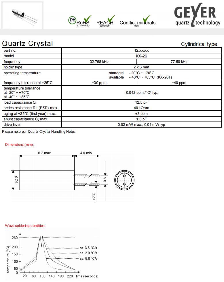 12.80115|32.768KHz|12.5pF|格耶小型圓柱晶體,歐美晶振品牌,格耶晶振,KX-26T進口晶振,無源晶振,12.80115晶振,圓柱插件晶振,石英晶體諧振器,206mm晶振,頻率32.768KHz,負載12.5pF,頻率容差20ppm,工作溫度-40~85°C,無鉛環(huán)保晶振,小尺寸晶振,高精度晶振,移動電話晶振,尋呼機晶振,物聯網晶振,通信設備晶振.