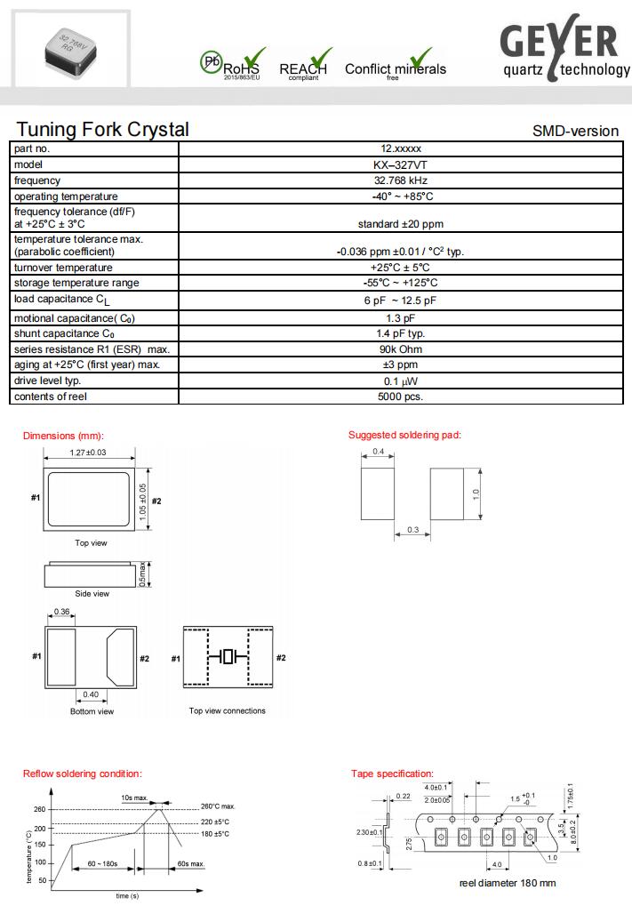 12.87001|32.768KHz|9.0pF|格耶電子,歐美進口晶振,格耶電子晶振,KX-327VT音叉晶體,12.87001晶振,石英晶體諧振器,無源晶振,1210mm晶振,二腳貼片晶振,頻率32.768KHz,負載9.0pF,頻率容差20ppm,工作溫度-40~85°C,高穩定性晶振,無鉛環保晶振,超小型晶振,平板電腦晶振,兒童智能手表晶振,智能體溫計晶振,電子體重秤晶振.