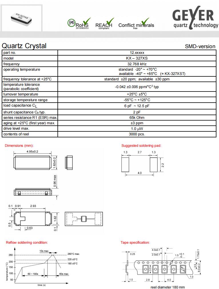 • 產品應用: Geyer晶振,KX-327XS進口石英晶振,無源晶振,12.87126晶振,4918貼片晶振,石英晶體諧振器,二腳貼片晶振,SMD晶振,頻率32.768KHz,負載12.5pF,頻率容差20ppm,工作溫度-20~70°C,高端晶體,高精度晶振,無鉛環保晶振,移動應用晶...