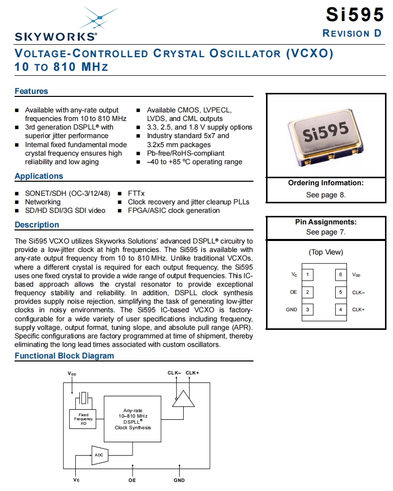 | 595BC216M000DG | Skyworks Solutions Inc. | Si595 | 216 MHz | LVDS | 3.3V | ±50ppm |