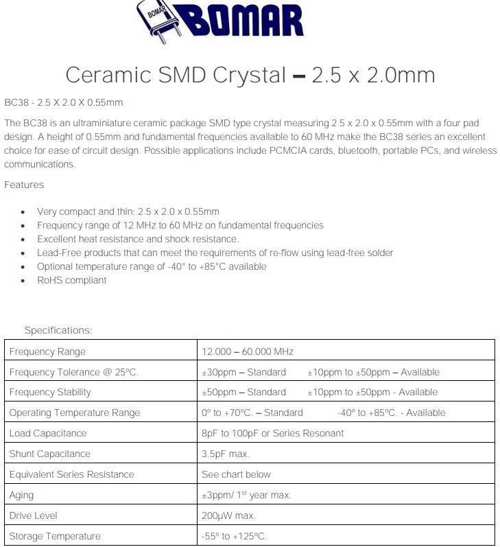 Bomar晶振,BC38石英諧振器,6G相關設備晶振,歐美進口晶振,Bomar晶振,BC38系列是一款超小型陶瓷表面貼裝(SMD)晶體,尺寸為2.5x2.0x0.55mm,0.55mm的高度和60 MHz的基頻使BC38系列成為許多應用的絕佳選擇,小體積無源晶振,石英諧振器,四腳貼片晶振,2520mm晶振,6G相關設備晶振,抗沖擊晶振,無鉛環保晶振,適合的應用包括便攜式電腦、PCMCIA卡、藍牙和無線通信等.