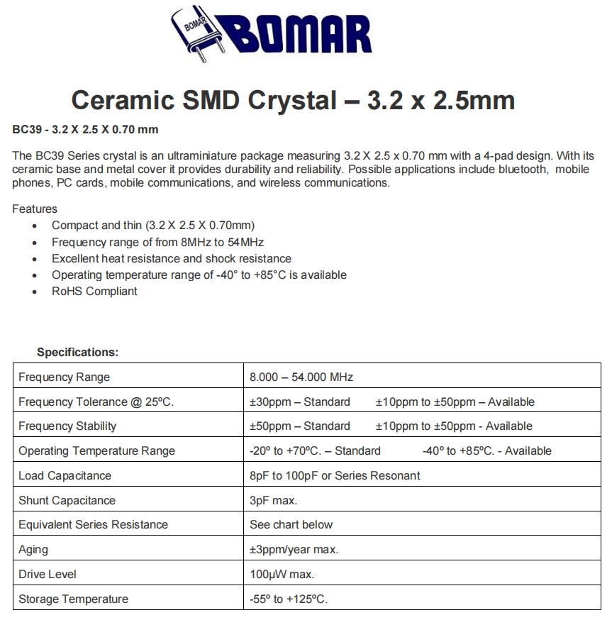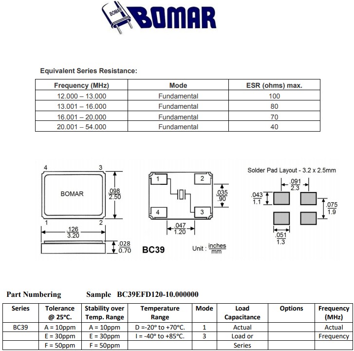 Bomar晶振,BC39EFD120-18.000000,6GWIFI應用晶振規格表