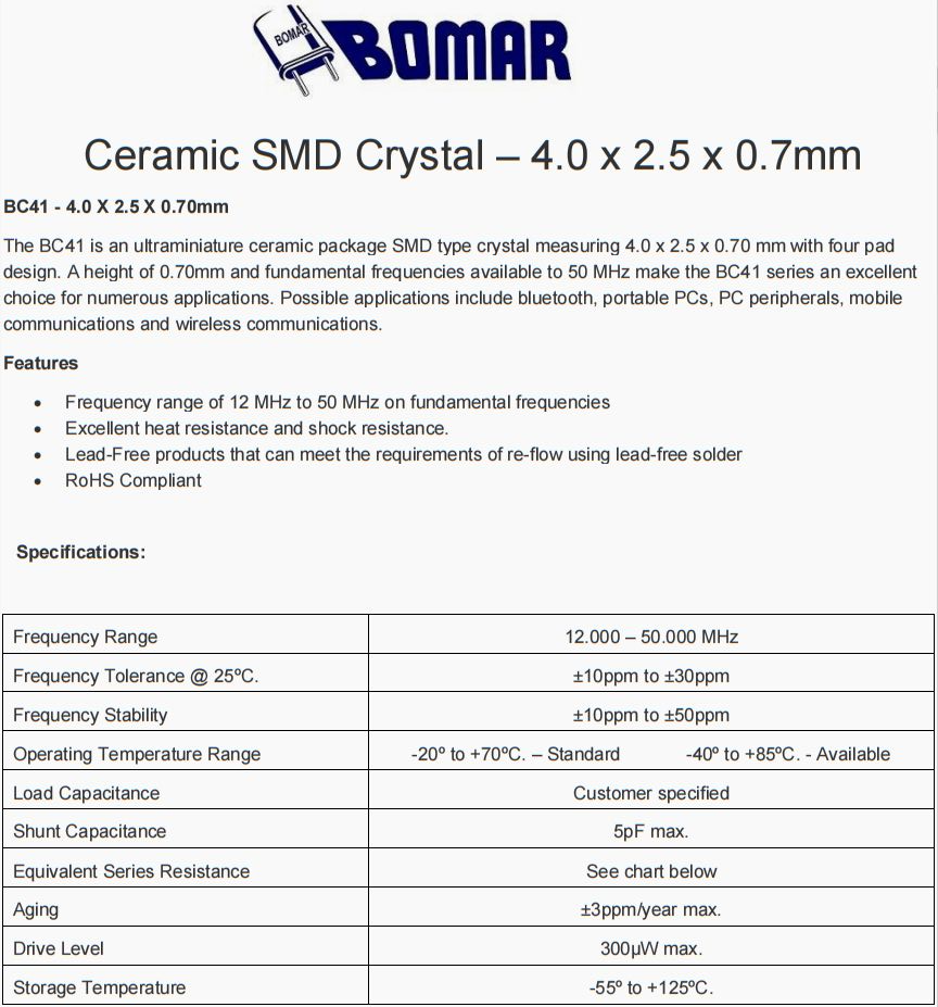 Bomar晶振,6G室外基站晶振,BC41小體積晶振,美國Bomar晶振公司,BC41是一款尺寸為4.0 x 2.5 x 0.70 mm的超微型陶瓷封裝SMD型晶體,采用四焊片設計。0.70mm的高度和50 MHz的基頻使BC41系列成為眾多應用的絕佳選擇。可能的應用包括藍牙、便攜式個人電腦、個人電腦外圍設備、移動通信和無線通信。高品質晶振,6G發射器晶振,6G通訊設備晶振,高精度儀器晶振,6G以太網晶振,無源晶振,SMD封裝,5032晶振,四腳晶振,貼片晶振,石英晶振