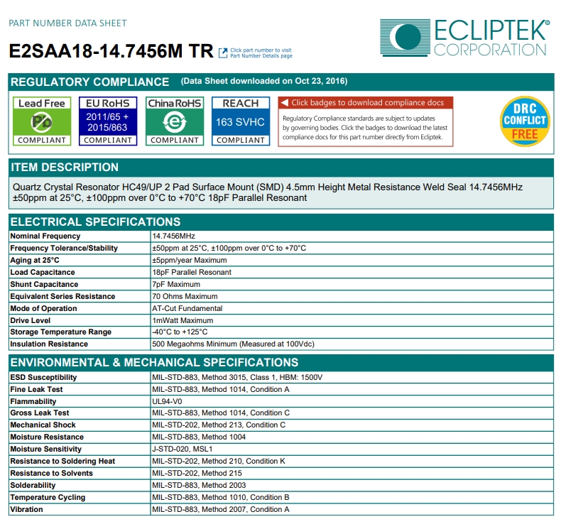 E2SAA18-14.7456M TR|ECLIPTEK晶振|SMD晶振,物料編碼E2SAA18-14.7456,頻率14.7456MHZ,精度±50ppm,負載電容18PF,尺寸:2-Pin HC-49/UP SMD,溫度范圍:0℃-70℃,SMD晶振,無源晶振,ECLIPTEK晶振,歐美晶振,晶振,石英晶振,特點:輕型,薄型,小型,應用于數碼相機,錄影機,數碼游戲機,游戲手柄,無人飛機,GPS導航,充電寶,移動電源,無線路由器等.