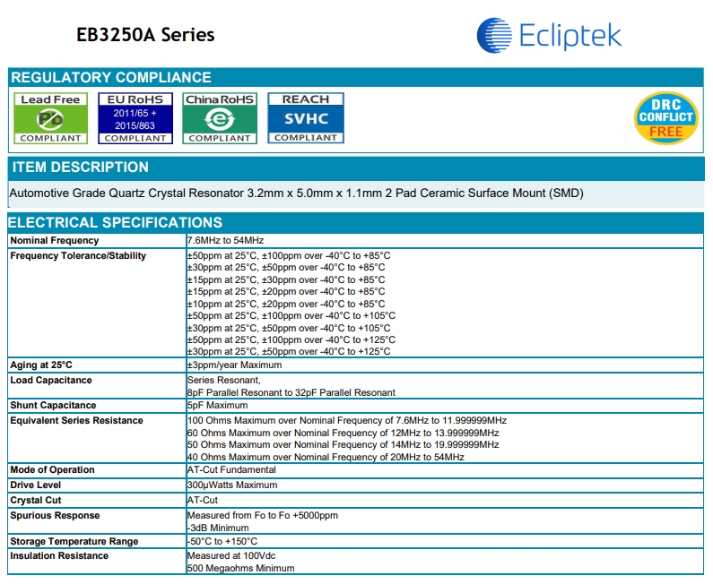 EB3250AYA08-25.000M TR|EB3250A|5032晶振,物料編碼EB3250AYA08-25.000M TR,型號EB3250A,頻率25MHZ,精度±50ppm,負載電容8PF, 尺寸:5.0*3.2.1.2mm,溫度范圍:-40℃-125℃,SMD晶振,晶振,無源晶振,石英晶振,ECLIPTEK晶振,晶振廠家,石英晶體諧振器,應用于洗衣機,空調,遙控器,微波爐,熱水器,電飯煲,電磁爐.