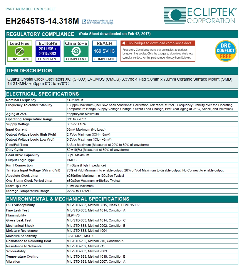 EH2645TS-14.318M|30PF晶振|SMD晶振,物料編碼EH2645TS-14.318M,頻率14.318MHZ,精度±50ppm,負載電容30PF, 輸出LVCMOS 60%,尺寸: 4-Pin CSMD Bulk,溫度范圍:0℃-70℃,電壓3.3V,SMD晶體,有源晶振,SPXO晶振,ECLIPTEK晶振,歐美晶振,晶振,石英晶體振蕩器,特點:輕型,薄型,小型,低電源電壓,低耗能,低功耗,應用于車載導航,車載雷達,胎壓感測,車載音響,車載影像系統(tǒng).