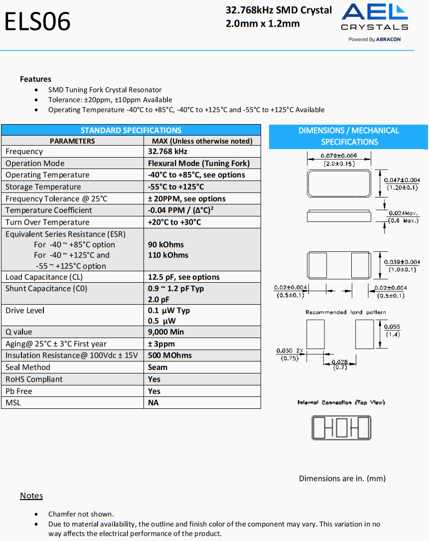 ELS07-32.768kHz-T AEL Crystals ELS07 32.768 kHz 0 ±20ppm 12.5 pF
