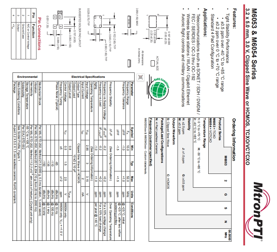 | M6053S017 20.480000 | M6053 and M6054 | TCXO | ±1.5 ppm | 20.48 | 3.2 X 5.0 mm | 0?C to +70?C | 3.3 |