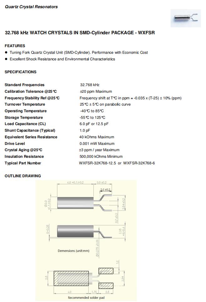 WXFSR-32K768-6|32.768KHz|6pF|Fortiming貼片圓柱規格表