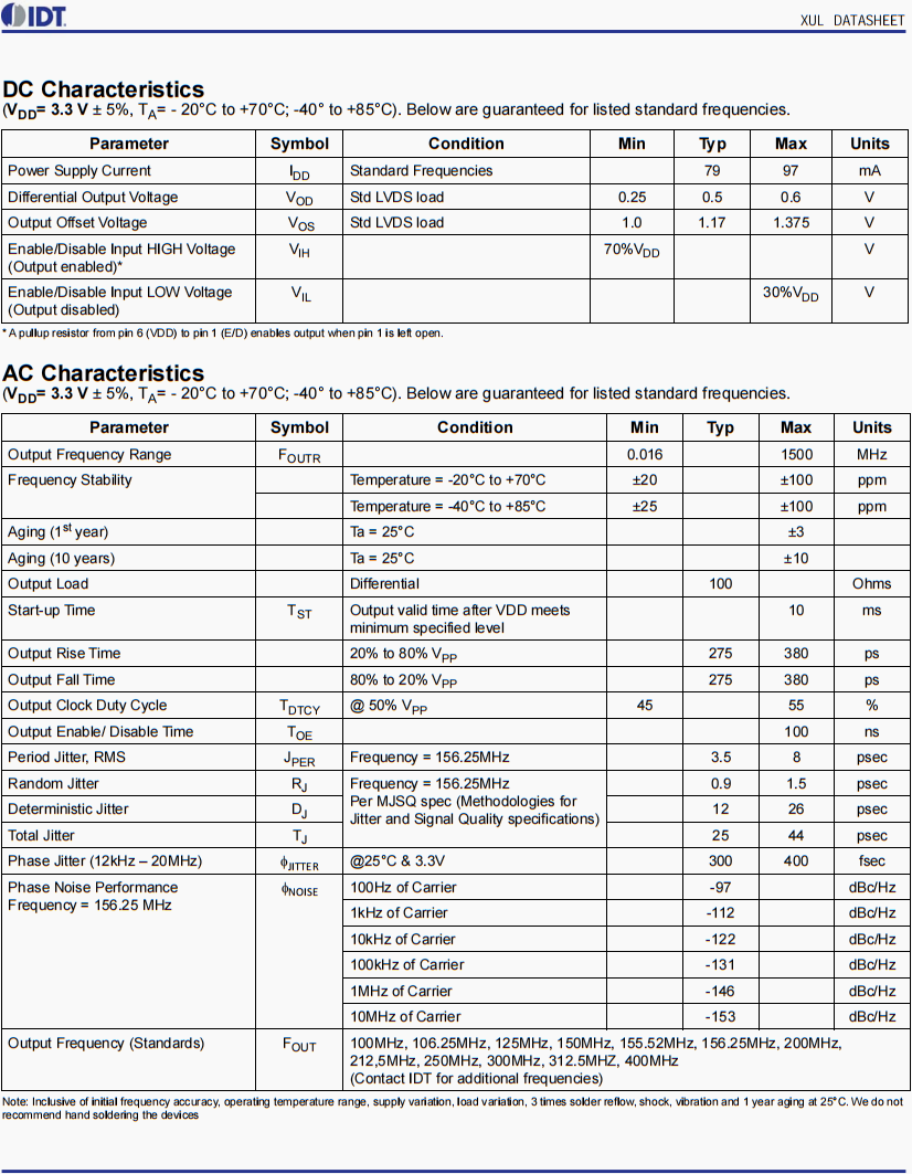 | XUL535125.000JS6I | IDT晶振 | XUL | XO (Standard) | 125MHz | LVDS | 3.3V |