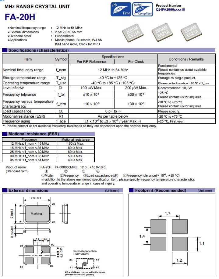 | Q24FA20H00054 | 2.5 x 2 x 0.55mm | FA-20H | 24.000000 MHz | 12 pF | +/-30 ppm | -20 to +75 °C |