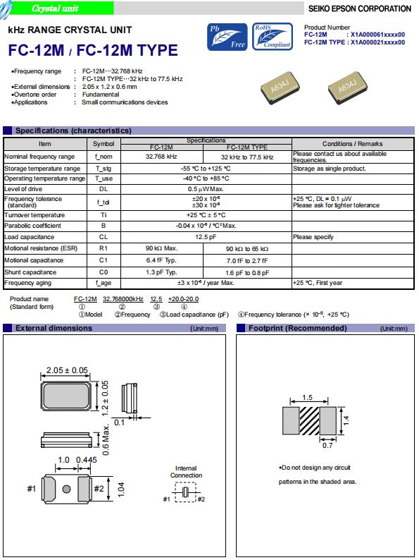 | X1A000061003500 | 2.05 x 1.2 x 0.6 mm | FC-12M | 32.768kHz | 7 pF | +/-10.0 ppm | -40 to +85 °C |