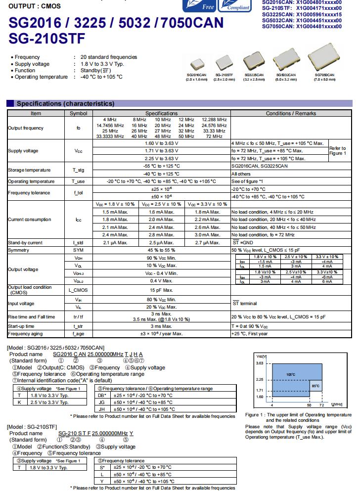 | X1G0041710035 | 愛普生石英晶振 | SG-210STF | 27.000000 MHz | 2.50 x 2.00 x 0.90 mm | CMOS有源晶振 | 1.600 to 3.600 V | -40 to 85 °C |