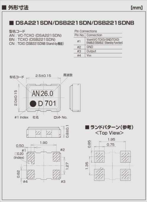 KDS晶振,DSA221SDN晶振,2520mm晶振,頻率范圍:19.2MHz/26MHz/38.4MHz/40MHz/52MHz,厚度2.5 × 2.0 × 0.8mm,應(yīng)用于:無線通信設(shè)備.