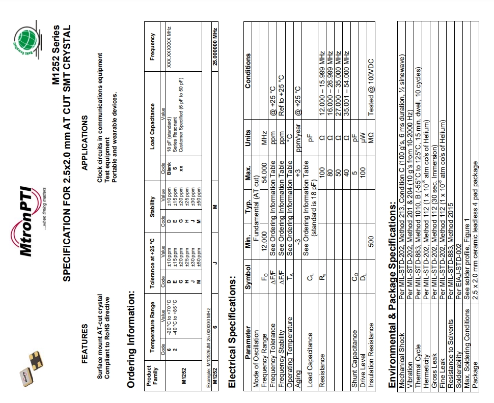 | MTRONPTI晶振規格 | 單位 | M1252晶振 | 石英晶振基本條件 |