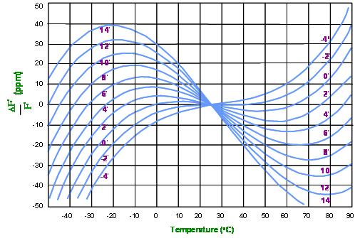 大部份的石英晶體產品是用于電子線路上的參考頻率基準或頻率控制組件, 所以, 頻率與工作環境溫度的特性是一個很重要的參數. 事實上, 良好的頻率與溫度(frequeny versus temperature)特性也是選用石英做為頻率組件的主要因素之一. 經由適當的定義及設計, 石英晶體組件可以很容易的就滿足到以百萬分之一 (parts per million, ppm) 單位等級的頻率誤差范圍. 若以離散電路方式將LCR零件組成高頻振蕩線路, 雖然也可以在小量生產規模達到所需要的參考頻率信號誤差在ppm或sub-ppm等級要求, 可是這種方式無法滿足產業要達到的量產規模. 石英組件的頻率對溫度特性更是離散振蕩線路無法簡易達成的. 在(圖一) 中提供了數種不同的石英晶體切割角度的頻率對溫度特性曲線.