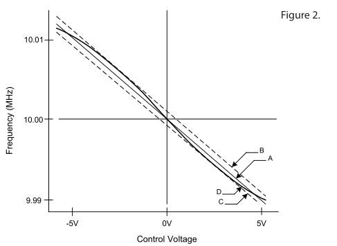 產生圖2所示特性的VCXO使用超突變結變容二極管,偏置以適應雙極性(±)控制電壓.產生圖3特性的VCXO使用具有施加的單極控制電壓的突變結變容二極管(在這種情況下為正).