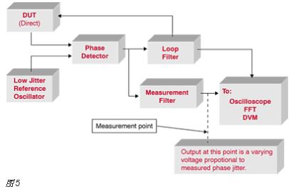 o 在時域中,圖5中相位檢測器的輸出信號包含有關測量時鐘抖動的大量信息。使用示波器直接檢查信號可以顯示Pk-Pk抖動。真正的RMS電壓表可用于測量RMS(一個西格瑪)抖動。對于這些測量,使用的測量濾波器代表感興趣的抖動頻率帶是至關重要的。當需要10 kHz至1 MHz的帶寬時,測量直流至10 MHz的噪聲是沒有意義的。具有直方圖和統計功能的示波器可用于表征測量的抖動。