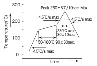 | 8 | 焊料耐熱性試驗(yàn) | 回流三次,180±10°C 90±30秒,峰值溫度260±5°C(最長(zhǎng)10秒),(230°C至30±10秒) | * 1 |