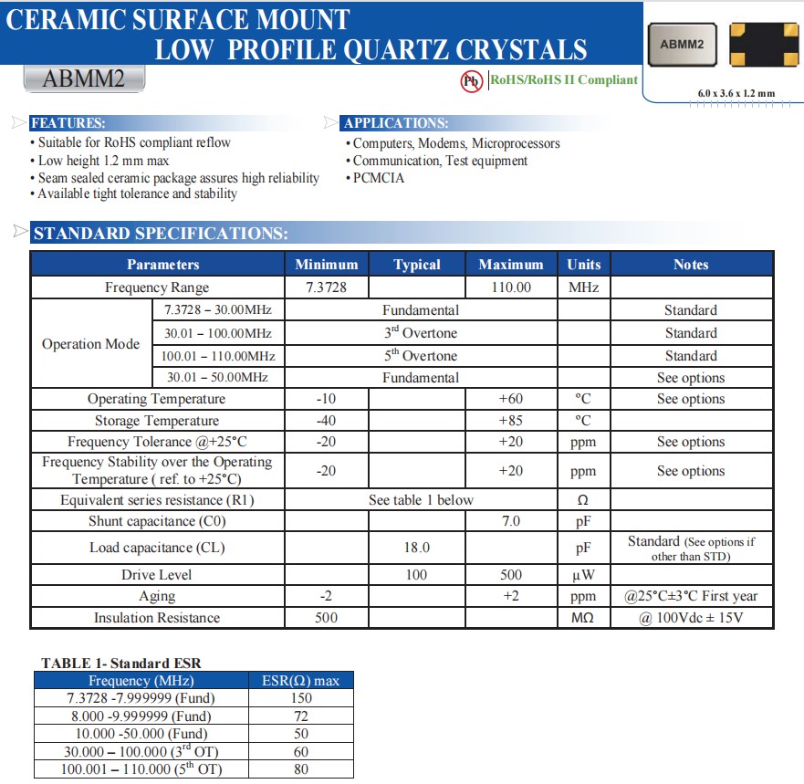 | ABMM2-7.3728MHZ-E2-T | Abracon晶振 | ABMM2 | MHz Crystal | 7.3728MHz | 4-SMD, No Lead |