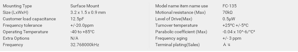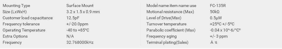 | 3.2 x 1.5 x 0.9 mm | FC-135 | Q13FC1350001700 | 32.768000 kHz | -40 to +85 °C | ≤ 70 KΩ |