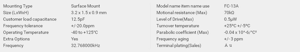 | 3.2 x 1.5 x 0.9 mm | FC-13A | X1A000091000100 | 32.768000 kHz | -40 to +125 °C | ≤ 70 KΩ |