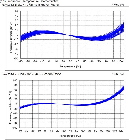 但是值得注意的是,任何事物都有極限,石英晶振也有,那么這里的-40-125℃就是這款產品的極限了,超出這個范圍會發生不可預知的事情,比如損壞,性能,穩定性下降等等;但是在這種極限條件下它的穩定性依舊是比不上在-40-85℃,因為高溫環境會削弱晶振的穩定性,使其穩定性降低,這可以通過溫頻特性曲線很明顯的看出.不過能在這樣高溫環境下穩定起振就已經非常了不起了.