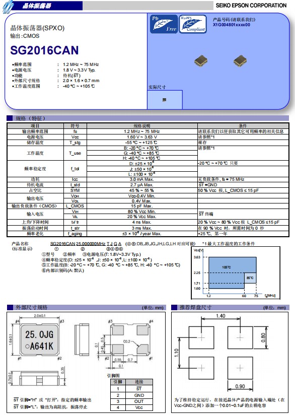 愛普生晶振SG2016CAN,是一款帶CMOS輸出的簡單封裝晶體振蕩器(SPXO)系列,小體積晶振尺寸2.0x1.6mm,四腳貼片晶振,有源晶振,石英晶體振蕩器,頻率范圍1.2MHz至75MHz,1.8V至3.3V的寬工作電壓和寬工作溫度范圍從-40°C到105°C。這些SPXO具有低電流消耗,高穩(wěn)定性、超小型,輕薄型、低功耗,低抖動,寬溫等優(yōu)勢。 這些SPXO非常適合移動通訊,智能手機,物聯(lián)網(wǎng)、可穿戴設(shè)備、醫(yī)療、工業(yè)自動化等各種應(yīng)用。