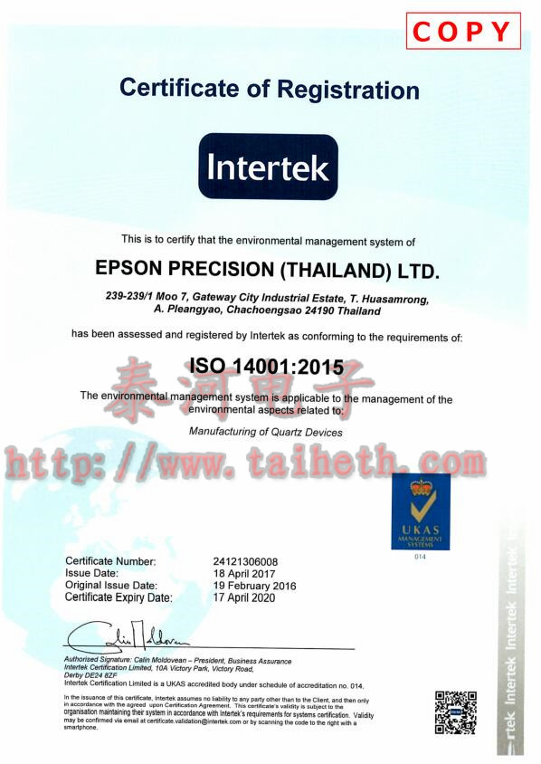 愛普生精密(泰國)有限公司EPSON PRECISION(THAILAND)LTD.于2017年4月18日獲得INTERTEK認證公司頒發的ISO 14001認證書.至2020年4月17日到期.證書編號:24121306008.