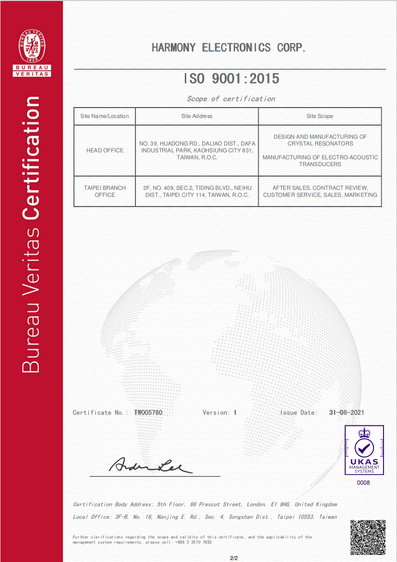 臺灣加高晶振公司通過ISO 9001:2015認(rèn)證,X1H024576DK1H-X晶振,必維國際檢驗集團(tuán)認(rèn)證控股公司SAS – 英國分公司證明管理層上述組織的系統(tǒng)已經(jīng)過審核,晶體諧振器的設(shè)計和制造符合管理體系標(biāo)準(zhǔn)的要求,詳述如下