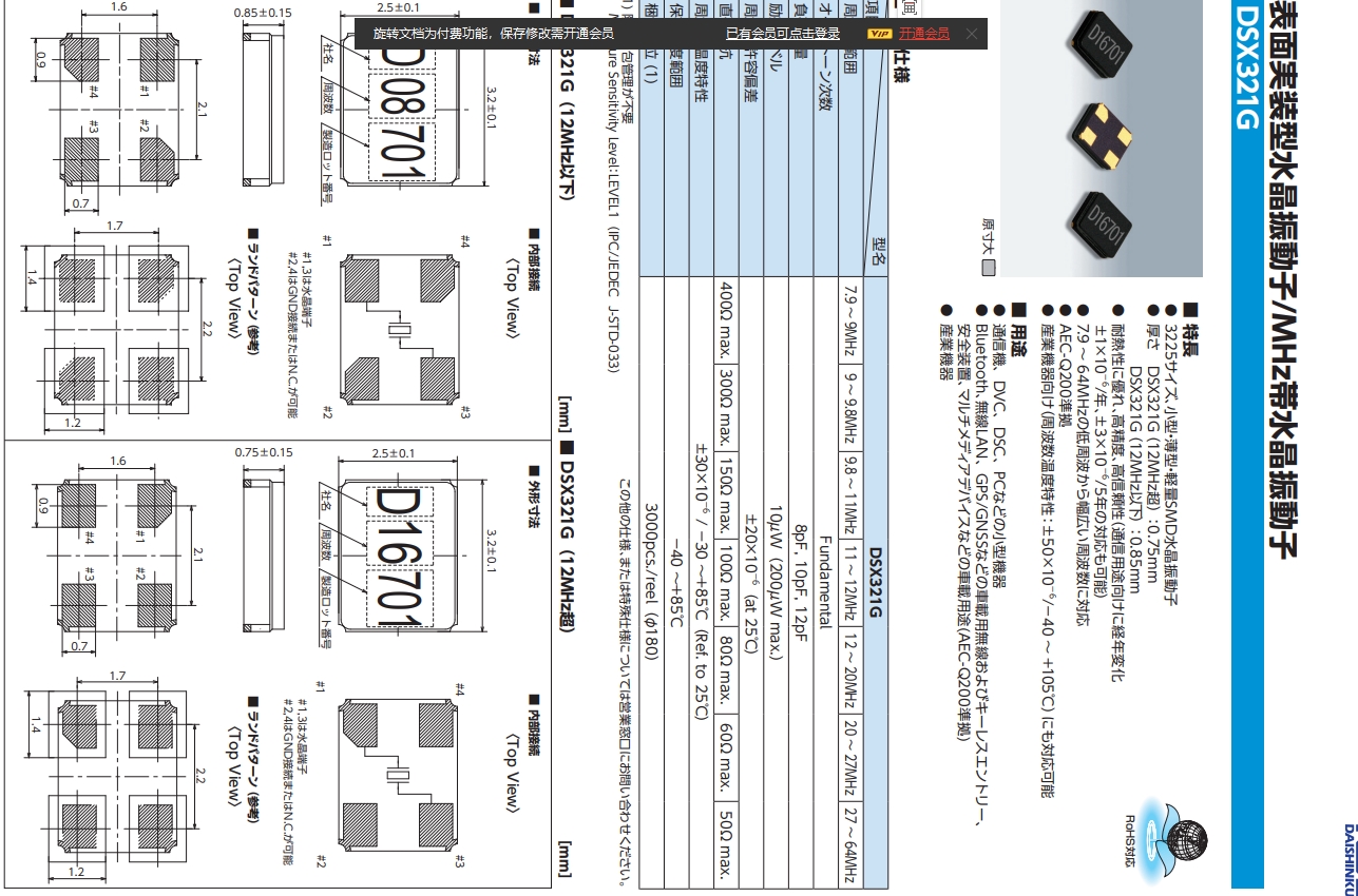 1B326000BC0A|DSX321G|3225mm|KDS晶振,編號1B326000BC0A,四腳貼片晶振.日本KDS進口晶振,SMD晶體諧振器,特點:3225尺寸,小型、薄型、輕量SMD晶振器,耐熱性好,高精度,高可靠性(面向通信用途經年變化也可支持±1×10 - 6/年或±3×10 - 6/5年),支持7.9 ~ 64mhz的低頻到廣泛的頻率,用途:工業設備,通信器、DVC、DSC、PC等小型設備,藍牙、無線LAN、GPS/GNSS等車載無線及無鑰匙進入;安全裝置、多媒體裝置等車載用途(兼容AEC-Q200).