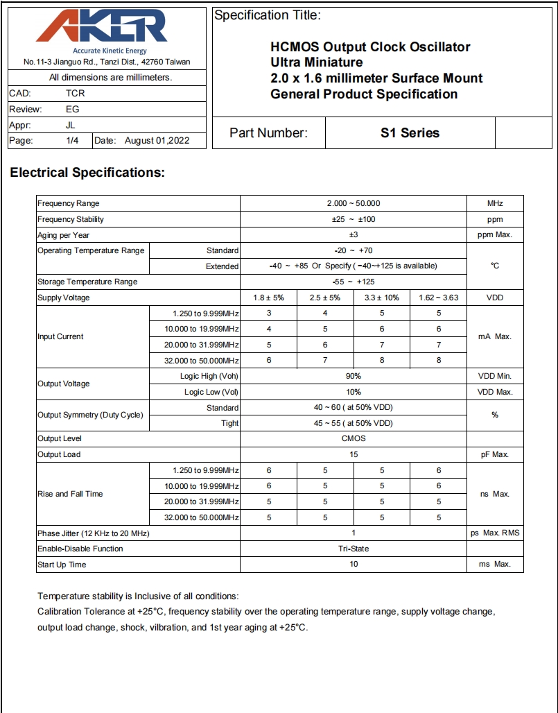 S133025T-50.000-X-R3|50MHz|3.3V|臺灣AKER晶振規格表