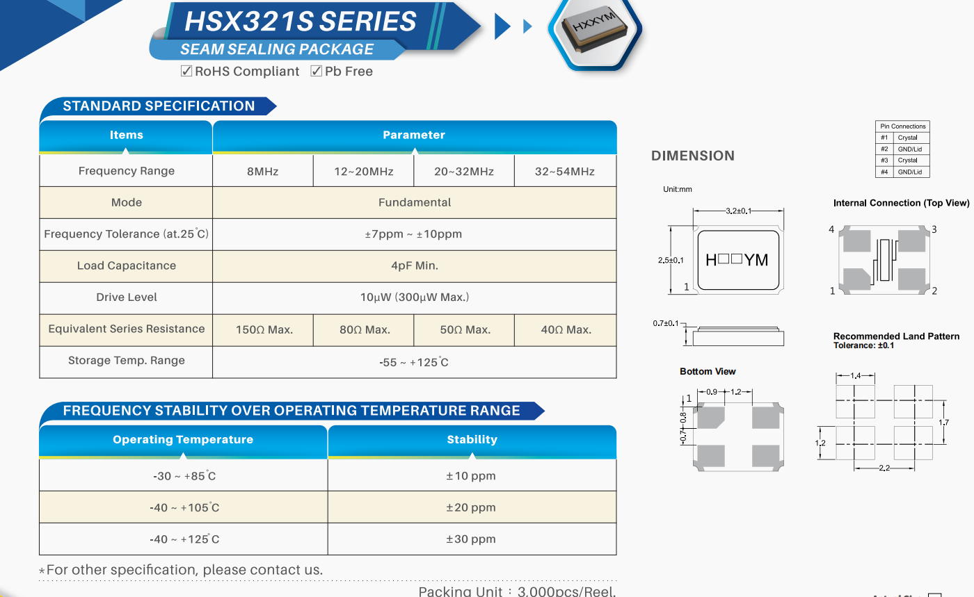 | X3S025000D81H-HU | 加高晶振 | HSX321S | 25 MHz | ±20ppm | ±20ppm | 8pF | -40°C ~ 105°C |