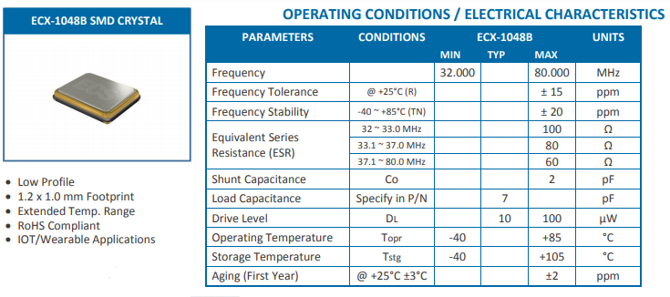 越小型的ECX-1048B晶振是ECS Inc最小巧的緊湊型石英晶振.尺寸僅為1.2*1.0*0.33mm,陶瓷封裝頻率可從32.000MHZ到80.000MHZ,在25度下頻率偏差可達+-15PPM,在高溫-40~+85度的情況下頻率穩(wěn)定度仍可達+-20ppm.負載電容常用的是7PF,聯(lián)系我們可以根據(jù)所需要求訂制相同參數(shù)產(chǎn)品.