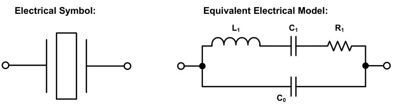 石英晶體單元是無(wú)源元件,沒有極性.基本共振頻率下石英晶體的等效電路由等效電氣模型表示: