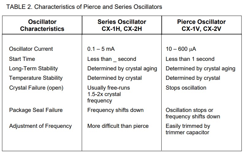 The choice of crystal or oscillator types depends primarily on performance requirements. Table 2 summarizes the performance characteristics of pierce and series oscillators. The CX-1V crystal has a higher Q than the CX-1H because it is sealed in an evacuated package. The CX-1H crystal has approximately 3 to 5 times higher motional resistance (lower Q) because it is hermetically sealed close to atmospheric pressure.