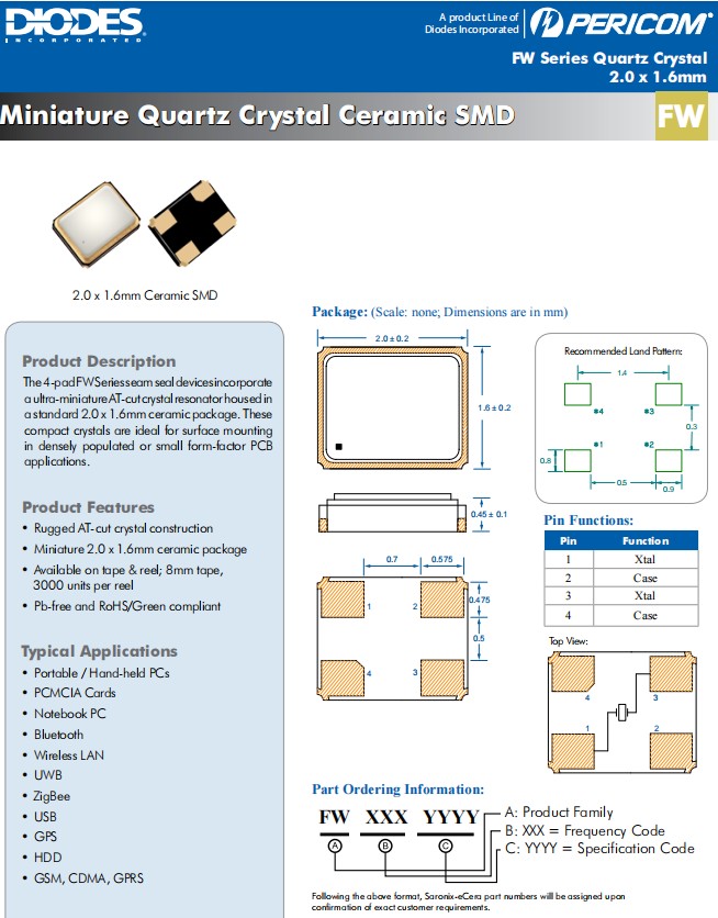| Diodes晶振規格 | 單位 | FW貼片晶振頻率范圍 | 石英晶振基本條件 |